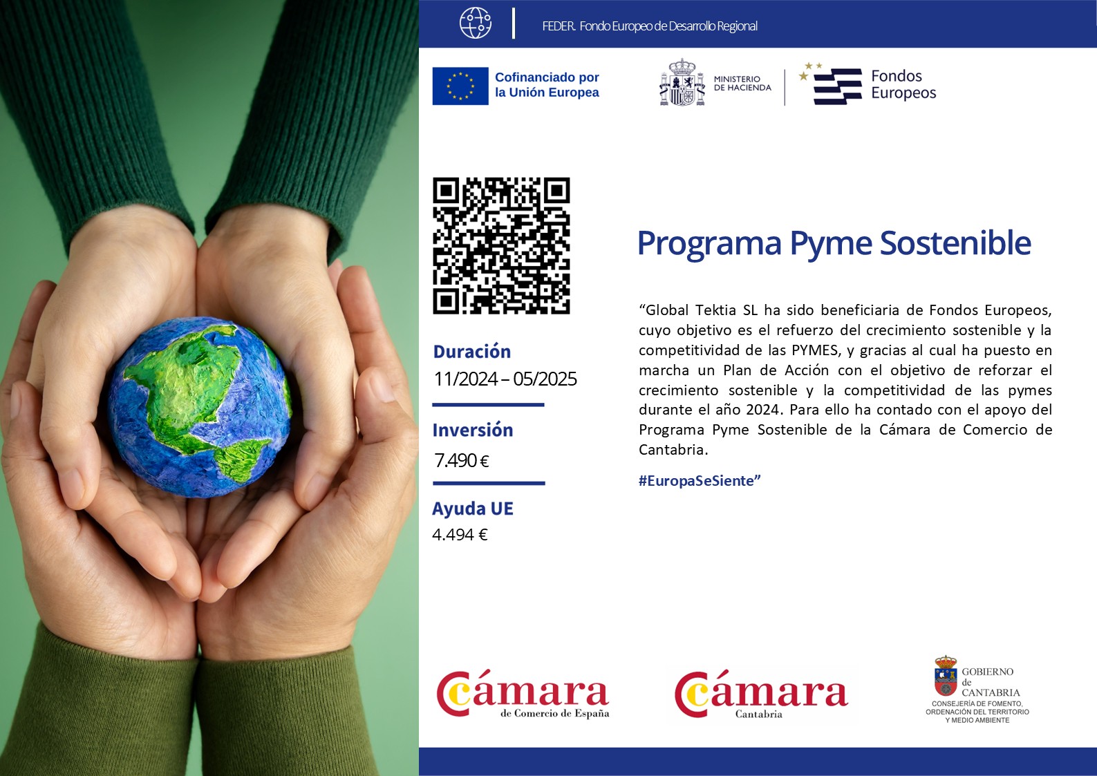 Tektia ha sido beneficiaria de Fondos Europeos, cuyo objetivo es el refuerzo del crecimiento sostenible y la competitividad de las PYMES, y gracias al cual ha puesto en marcha un Plan de Acción con el objetivo de reforzar el crecimiento sostenible y la competitividad de las pymes durante el año 2024. Para ello ha contado con el apoyo del Programa Pyme Sostenible de la Cámara de Comercio de Cantabria.