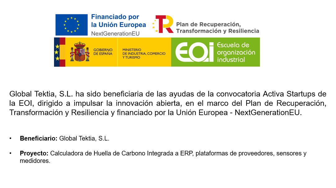 Global Tektia, S.L. ha sido beneficiaria de las ayudas de la convocatoria Activa Startups de la EOI, dirigido a impulsar la innovación abierta, en el marco del Plan de Recuperación, Transformación y Resiliencia y financiado por la Unión Europea – NextGenerationEU.